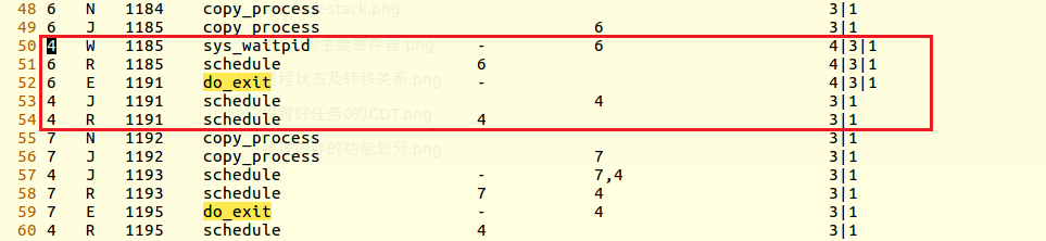 do_exit将进程的状态设为僵尸态(TASK_ZOMBIE),所以这里需要记录进程的退出(E)。子进程终止时,它与父进程之间的关联还会保持,直到父进程也正常终止或父进程调用wait才告结束。因此,进程表中代表子进程的表项不会立即释放。虽然子进程已经不再运行,但它仍然存在于系统中,因为它的退出码还需要保存起来,以备父进程今后的wait调用使用。父进程等待子进程退出sys_waitpid