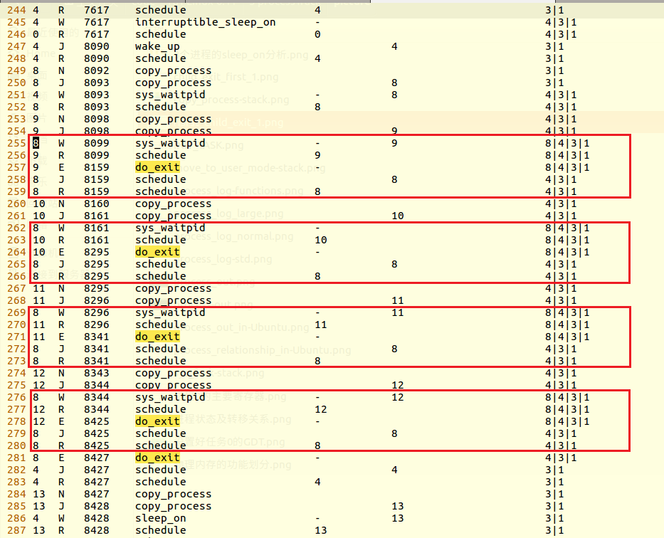 子进程退出的最后一步是通知父进程自己的退出,目的是唤醒正在等待此时间的父进程。从时序上说,应该是子进程先退出,父进程才醒来。下面来看下log文件中的一些印证了这个结论的记录: